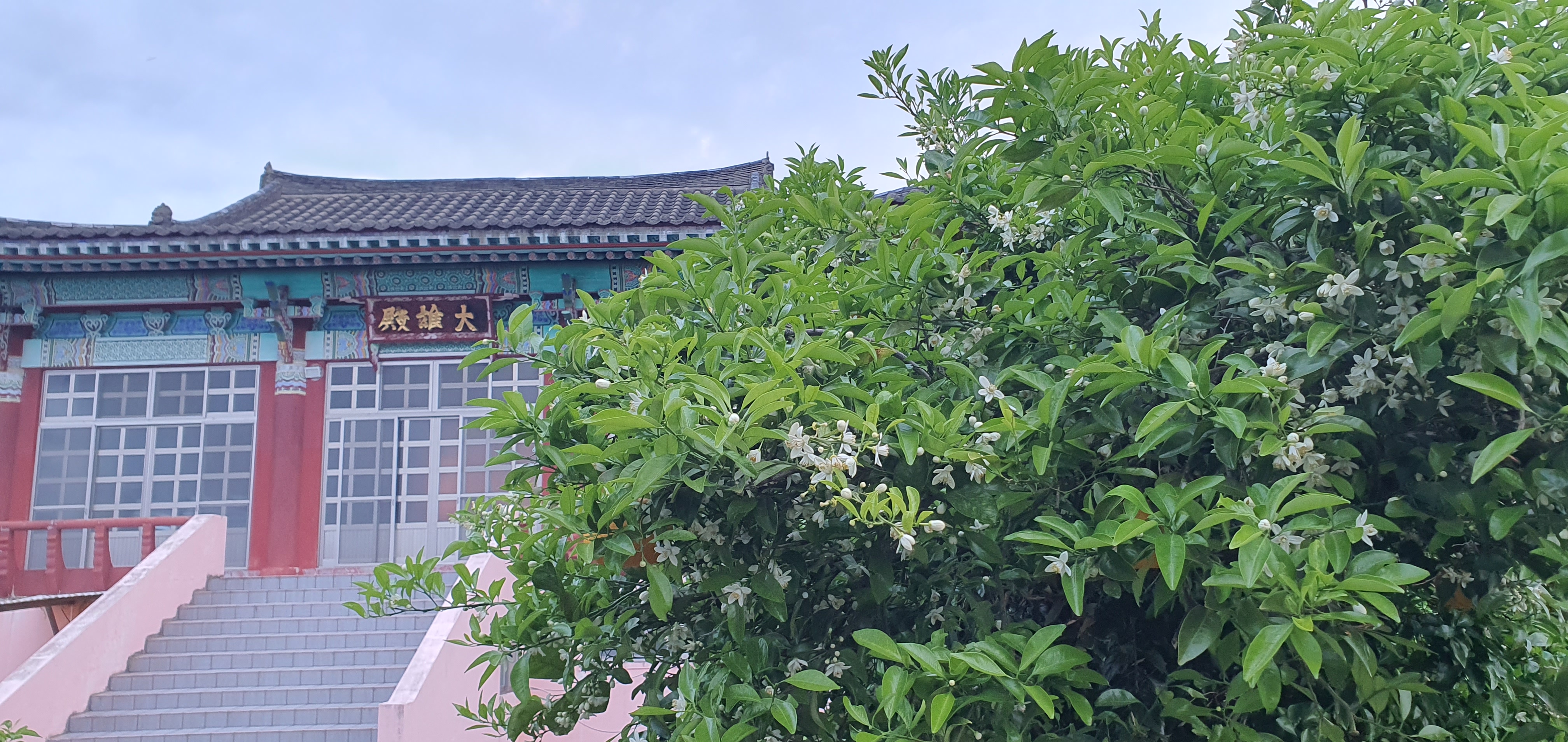 스님의 제주도 종남사 절 마당의 감귤나무에