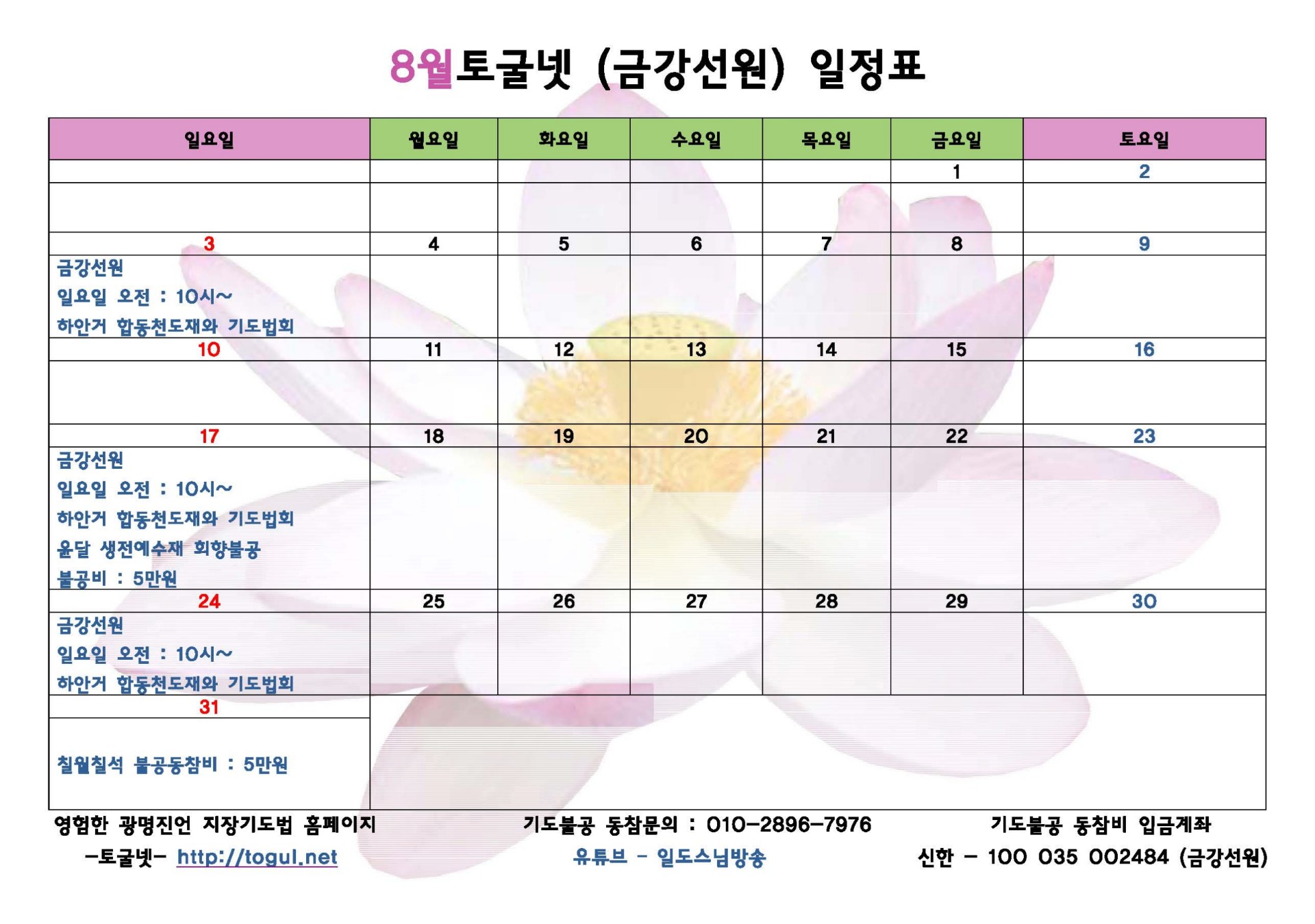 | (기도일정) 2025년8월. 일도스님과 함께하는 기도와 불공법회 일정 (2) | 2025.07.31 |
